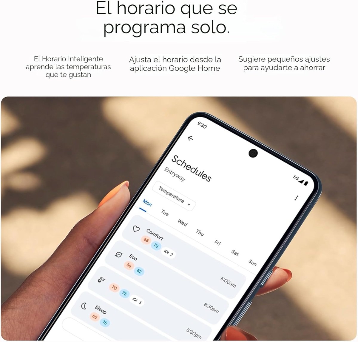 La programación inteligente es el gran protagonista en esta 4° generación de termostatos Nest. Lo que hace especial a este modelo es que no tienes que pasarte una tarde configurando horarios. El bicho te observa (de forma cariñosa, claro) y registra cada vez que subes la temperatura por la mañana y cada vez que la bajas antes de dormir. En unos días, habrá creado un horario automático que se adapta a ti como un guante.